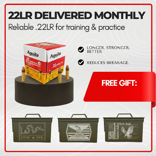 Join the Aguila .22LR Club and get dependable training ammo delivered automatically—plus a limited-edition, laser-engraved ammo can included free with your first subscription order.